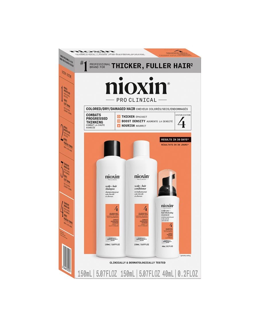 Zestaw do pielęgnacji włosów i skóry głowy Nioxin System 4 jest przeznaczony do włosów farbowanych z postępującym przerzedzeniem. Wzmacnia strukturę włosów i chroni je przed łamaniem. Ten unikalny zestaw trzech profesjonalnych produktów do włosów, oparty na zaawansowanej pielęgnacji skóry, został specjalnie opracowany jako zabieg zagęszczający włosy, dostarczając pełniejszego wyglądu. Nioxin System 4 zmniejsza wypadanie włosów spowodowane łamaniem, wzmacnia włosy i nadaje im naturalny zdrowy blask, jednocześnie odświeżając skórę głowy. Żelowy szampon Nioxin, który zamienia się w pianę, usuwa brud, sebum i inne zanieczyszczenia z głowy i włosów. Odżywka Nioxin Scalp Therapy to lekka odżywka, która pomaga w zachowaniu elastyczności włosów, nawilża skórę głowy i włos,y od nasady do końcówek. Nioxin Scalp & Hair Treatment odświeża skórę głowy i zwiększa objętość każdego włosa.